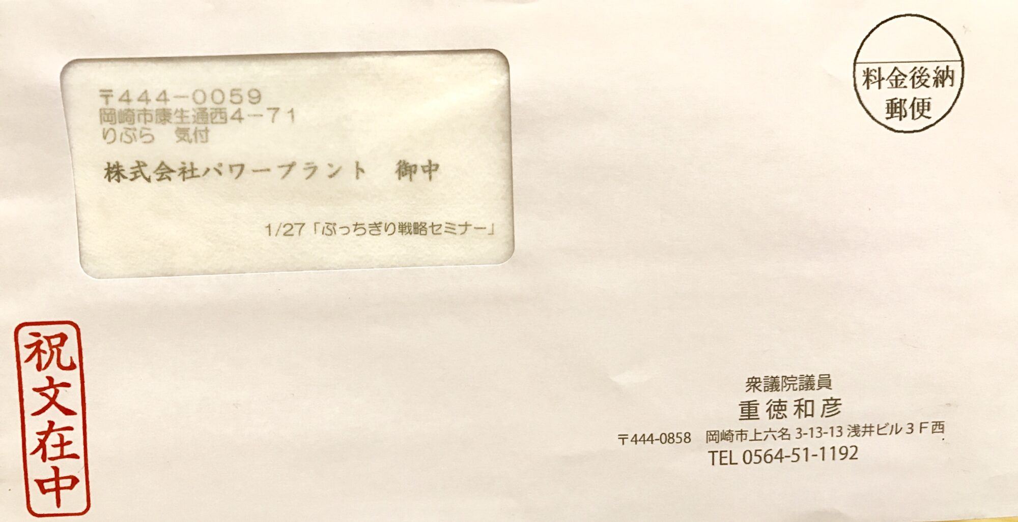 先日、岡崎ぶっちぎりセミナーの日、受付窓口の方から封書を渡されました。